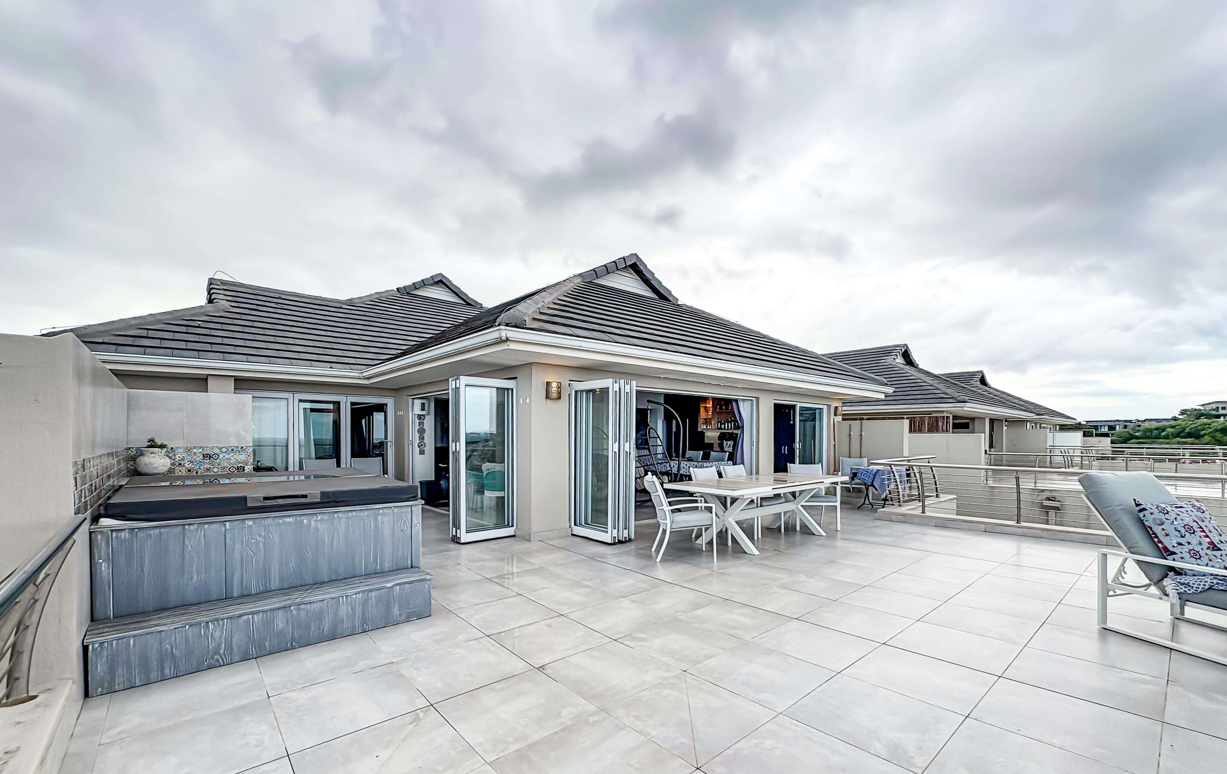 A sleek, minimalist setup with foldable furniture, string lights, and subtle décor creates a stylish yet functional outdoor corner.