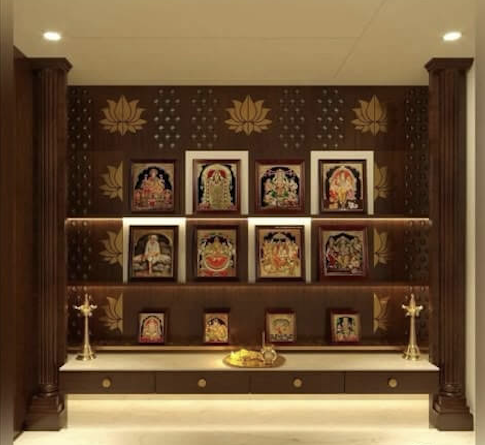 Soft yellow lighting with diya holders or LED lamps enhances spiritual vibes and peace.
